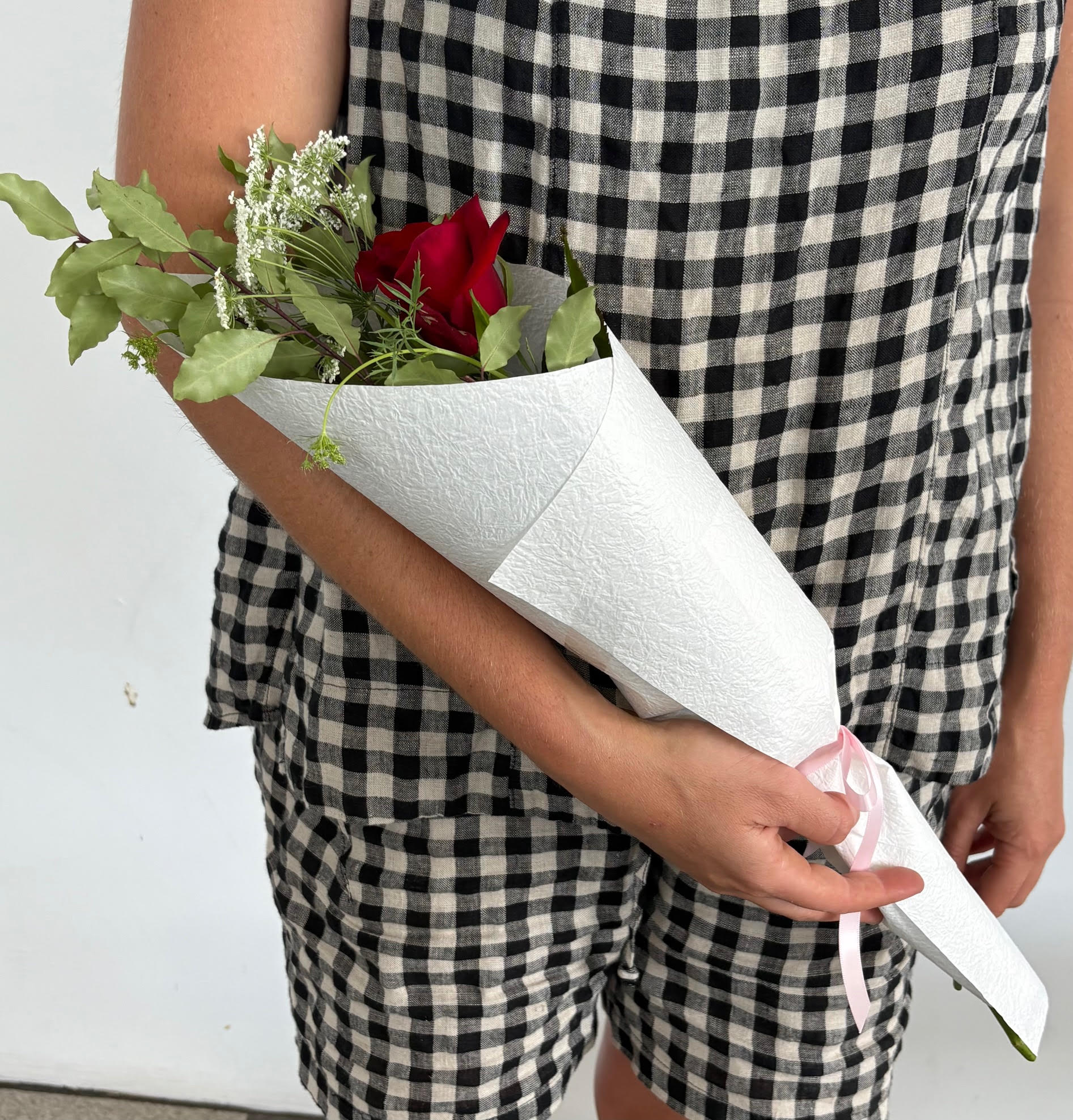 A beautiful gesture of love, featuring a locally grown red rose, foliage and filler wrapped with white paper & ribbon.
