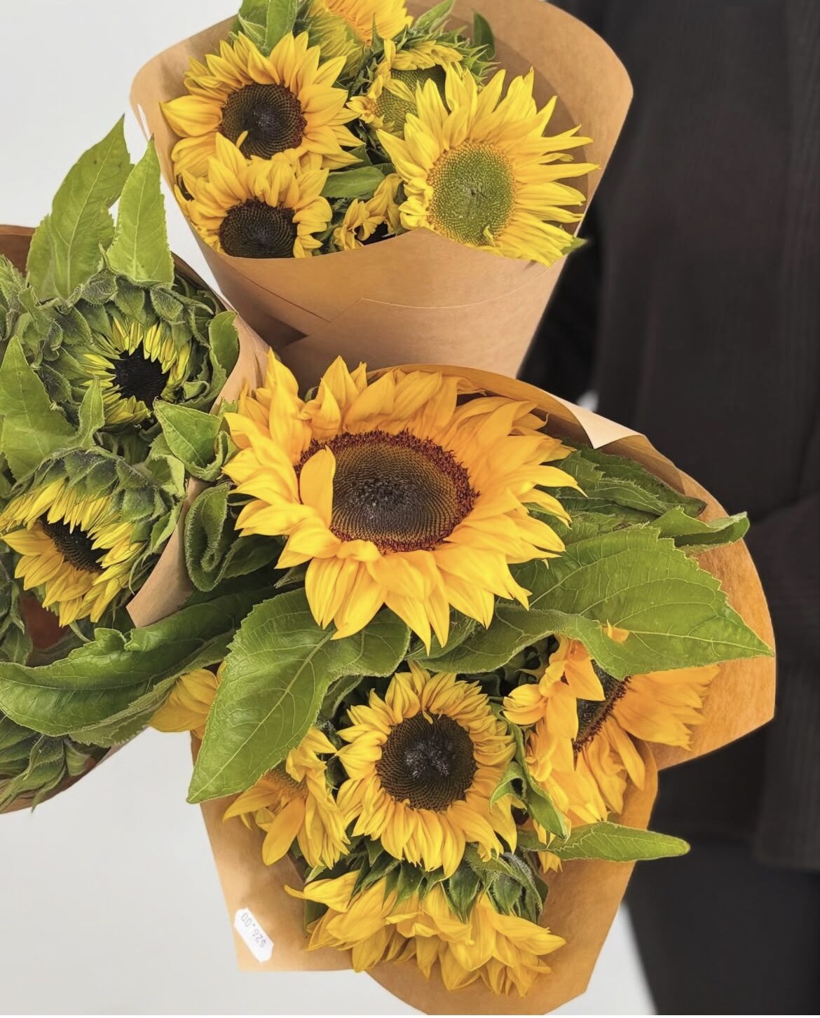 10 stems of sunflowers bundled in florist paper with ribbon.